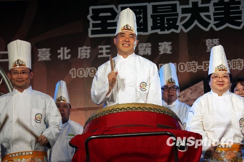 10月9日,臺(tái)北市長郝龍斌(中)一身廚師裝,擊鼓為第二屆臺(tái)北廚王爭(zhēng)霸賽暨2009臺(tái)北國際廚王邀請(qǐng)賽熱鬧揭幕。他表示,要將中華傳統(tǒng)美食發(fā)揚(yáng)光大,努力打造臺(tái)北成為“世界美食之都”。該比賽先從臺(tái)灣廚藝高手進(jìn)行爭(zhēng)霸賽,參賽者以鯖魚、鴕鳥肉與頂級(jí)腓力牛肉三種指定食材做出料理,決出優(yōu)勝者,再于12日和來自廣州、北京、上海、香港和新加坡、馬來西亞等地的“廚神”,切磋中華美食技藝,爭(zhēng)奪臺(tái)北國際廚王邀請(qǐng)賽的“廚王”桂冠。中新社發(fā) 黃少華 攝
