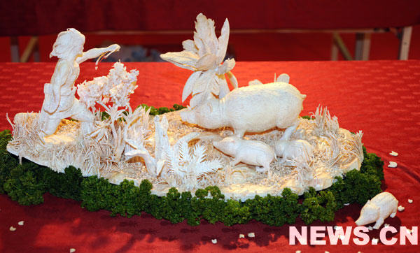 10月10日在臺(tái)北廚王爭霸賽上拍攝的用芋頭雕刻的作品。第二屆臺(tái)北廚王爭霸賽暨2009臺(tái)北國際廚王邀請(qǐng)賽于10月9日至12日在臺(tái)北舉行,兩岸廚師的高超廚藝令觀眾大開眼界。新華社發(fā)(吳景騰 攝)