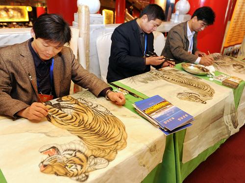 近日,作為河南省“中原文化寶島行”活動(dòng)之一的河南農(nóng)民畫(huà)展暨河南民俗藝術(shù)展在臺(tái)北開(kāi)展。活動(dòng)旨在幫助臺(tái)灣民眾深入了解中原文化。圖為農(nóng)民畫(huà)家在開(kāi)幕典禮上畫(huà)虎。新華社 吳景騰攝