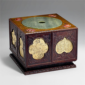 清朝乾隆年間的能工巧匠勤于創(chuàng)作,皇帝雖日理萬(wàn)機(jī),但仍會(huì)利用余暇欣賞宮廷收藏,甚至下旨工匠照樣仿制出袖珍品放在身旁的小型寶盒中,方便皇帝隨時(shí)把玩,這就是多寶格,意謂收納許多寶物的小柜。 多寶格的設(shè)計(jì),琳瑯多樣,精巧無(wú)比,不論盒、匣、箱、柜,皆是一種妥善利用空間的工藝作品、以最有限的空間,存放最多的物品,在造型上,力求美觀精巧,所以往往一件多寶格,箱蓋中有盒、盒中有套匣、套匣中又有屜、隱隱約約、輾轉(zhuǎn)曲折,有時(shí)一個(gè)轉(zhuǎn)紐,便見(jiàn)門(mén),門(mén)之后,另有一番天地。故多寶格體積雖小僅及尺許,而其所藏珍玩,每每多達(dá)數(shù)十,乃至百件,因此觀賞時(shí)常有尋尋覓覓、撲朔迷離的趣味。