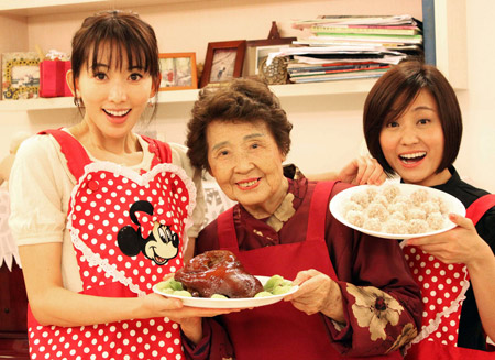 臺(tái)灣名模林志玲(左)向知名主持人海芬的奶奶(中)學(xué)做年菜。圖為林志玲手捧自己最愛的年菜紅燒蹄膀。(圖為TVBS圖)