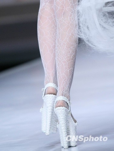 3月27日上午,2010年中國國際時(shí)裝周期間,北京服裝學(xué)院、臺(tái)灣實(shí)驗(yàn)大學(xué)2010屆優(yōu)秀畢業(yè)作品展演在北京飯店宴會(huì)大廳舉行。在展出的設(shè)計(jì)作品中,各式鞋子與服裝搭配,為設(shè)計(jì)作品增色。中新社發(fā) 陸欣 攝