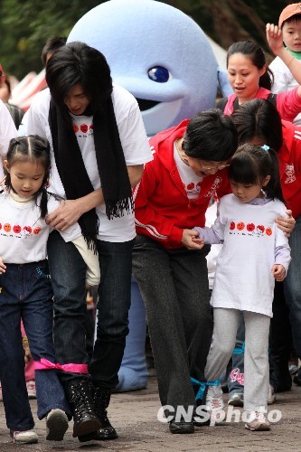 4月4日是臺(tái)灣傳統(tǒng)的“兒童節(jié)”,全臺(tái)各地有眾多親子活動(dòng)登場(chǎng),精彩紛呈。圖為當(dāng)天下午,兒童福利聯(lián)盟在臺(tái)灣大學(xué)舉辦“童心協(xié)力”活動(dòng),數(shù)百家長(zhǎng)與孩子們一起進(jìn)行趣味親子“兩人三腳”健走,臺(tái)灣著名歌手蕭敬騰(左二)亦參與其中。中新社發(fā) 董會(huì)峰 攝