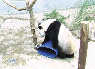 最近保育員提供大圓桶給“圓圓”玩耍,并在桶內(nèi)預(yù)藏食物,讓它為了找尋食物玩弄圓桶。“圓圓”對(duì)圓桶也很感興趣,不時(shí)翻滾圓桶快跑、翻筋斗與扭轉(zhuǎn)身體,玩累了就把圓桶當(dāng)懶人沙發(fā)趴在上面,由于效果不錯(cuò),將來(lái)也會(huì)提供給“團(tuán)團(tuán)”玩耍。