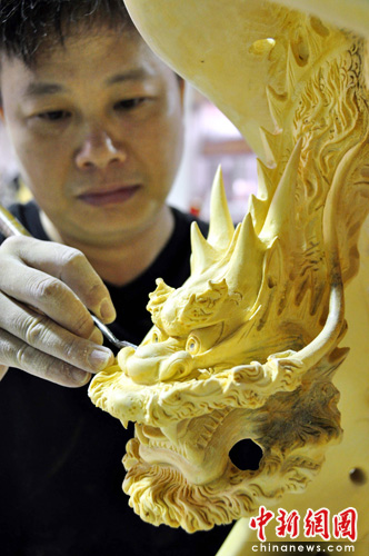 6月15日,來自臺灣的木雕高手官小欽在中國木雕現(xiàn)場創(chuàng)作大賽現(xiàn)場對作品《蛻變》中的一條龍進行雕琢。6月6日至16日,第二屆中國木雕現(xiàn)場創(chuàng)作大賽在福建省莆田市舉行,來自臺灣、福建、山西、浙江、江西等地的25名木雕高手參加了比賽,現(xiàn)場創(chuàng)作最優(yōu)秀作品將獲得“獎元獎”。 林劍冰 攝