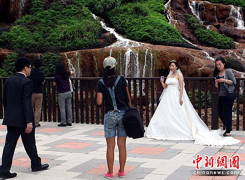 臺北縣九份一處自然風光旅游景點上,6月23日一對新人在拍攝婚紗照。據(jù)悉,該縣有居臺灣之最的野柳女王頭、淡水漁人碼頭、皇冠海岸等自然風光旅游景點,目前當?shù)芈糜尾块T正在盡力為游客提高旅游質(zhì)量做工作。中新社記者 宋吉河 攝