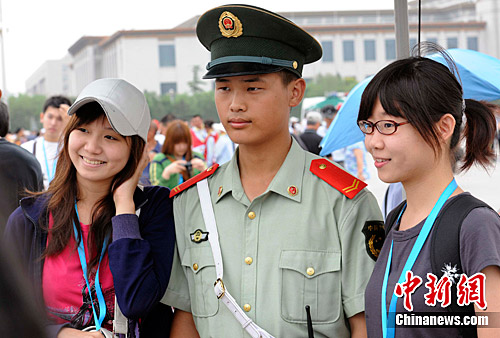 圖為來自臺灣的同學(xué)們爭相與天安門廣場執(zhí)勤的武警戰(zhàn)士合影。劉震 攝