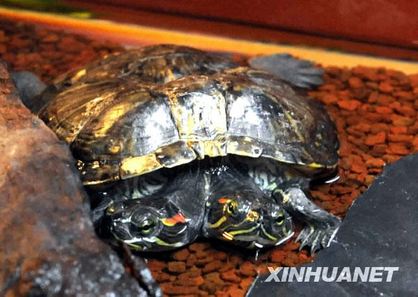 動(dòng)物展中展出的雙頭龜(2009年10月15日新華社記者 黃本強(qiáng) 攝)。