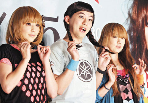 日本女子團(tuán)體帕妃PUFFY將來臺開演唱會,主持人黃子佼(中)扮成女裝與大貫亞美(右)、吉村由美一同亮相。 圖片來源:臺灣“聯(lián)合新聞網(wǎng)”
