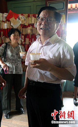 9月8日,中華文化聯(lián)誼會名譽會長蔡武在臺南市參觀赤崁樓。圖為蔡武喝著當?shù)孛癖娮畛R玫亩喜瑁^賞歷史古跡。中新社記者 劉舒凌 攝
