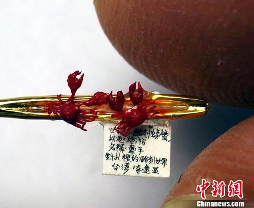 臺灣著名微雕家陳逢顯近日完成一件微雕作品,兩只置于針孔上“手牽手”的立體著色螃蟹。蟹體最寬處只有0.2厘米,系用凝結(jié)的樹脂作材質(zhì)。堪稱世界最小螃蟹。陳逢顯介紹,最難的是雕刻8只纖細(xì)的蟹腳和兩只大鰲。