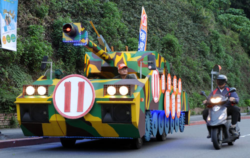 2010年“3合1”選舉將到,以往每到選舉,參選人將宣傳車裝上看板、音響及燈光等設(shè)備,但碰上9日在臺北街頭出現(xiàn)的這臺戰(zhàn)車,恐都自嘆不如,整車車頂削平套上戰(zhàn)車外殼,炮塔還可讓參選人站立拉票;只是過度改裝車體,又沒懸掛牌照,上路恐有違法之虞。來源:“中央社”