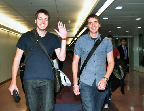 電影《哈利波特》系列首度有演員造訪臺灣,片中飾演榮恩雙胞胎哥哥的詹姆斯(右)與奧立佛·菲爾普斯(左),15日上午抵臺。 圖片來源:“中央社”