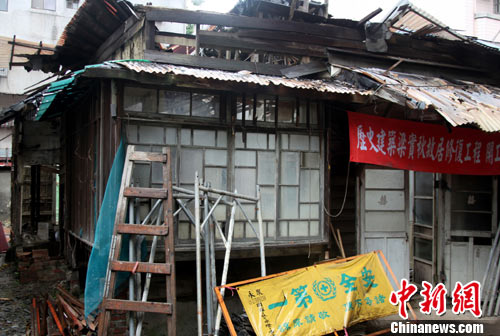 一代文壇名流梁實秋生前在臺居住地——位于臺北市云和街上的“雅舍”舊居,經(jīng)歲月消磨,早已殘敗不堪。2003年被臺北市政府指定為“歷史建筑”后,又經(jīng)多年踟躕,終于在不久前開始動工修復。圖為11月16日所見修復工程現(xiàn)場情景。據(jù)悉,該修復工程預計到明年6月24日完工。修復后的“雅舍”,計劃陳列展示梁實秋個人物品,并開放參觀。