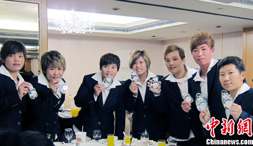 11月29日晚,臺灣有關(guān)方面在臺北為參加2010年第16屆廣州亞運會的中華臺北體育代表團(tuán)舉行慶功餐會。會上,該次亞運上的中華臺北金銀銅牌全體得主分別獲贈由臺灣大洋金幣公司提供的廣州亞運主題金銀紀(jì)念幣和熊貓團(tuán)團(tuán)圓圓紀(jì)念銀幣,共217枚總值80萬多元新臺幣。圖為運動員在展示受贈的紀(jì)念幣。