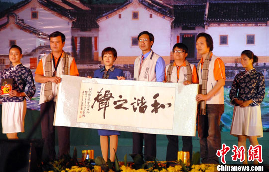 12月2日晚,在廣西賀州舉行的首屆客家文化旅游節(jié)兩岸文藝界聯(lián)誼晚會上,兩岸音樂人共奏“和諧之聲”,洋溢同胞親情,感動現(xiàn)場大批觀眾。圖為聯(lián)誼晚會上,兩岸文藝人士互贈禮物。 中新社發(fā) 廖祖平 攝