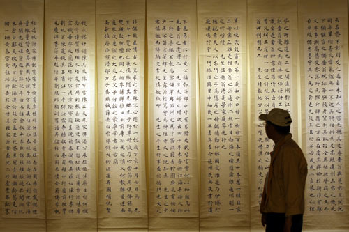 第7屆漢字文化節(jié)20日在“中正紀(jì)念堂”舉行,推出“四百年時(shí)空名家書法展”,展出媲美故宮文物的書法家真跡。 圖片來源:“中央社”