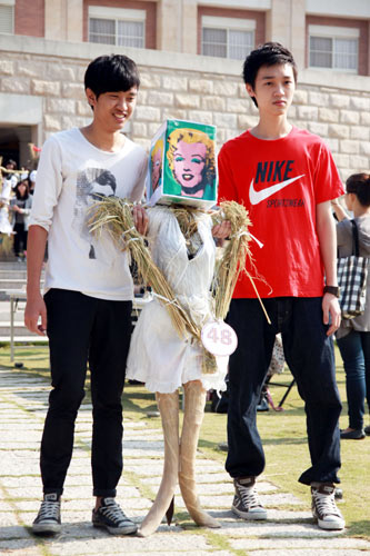 據(jù)悉,稻草人造型五花八門,有的扎成栩栩如生國際巨星邁克爾·杰克遜、瑪麗蓮·夢露、卡通人物超人等立體造型稻草人,還有色彩艷麗大膽的搖滾稻草人、造型俏皮的可愛稻草人,最后由視覺傳達系1年級的學生林素瑄等人的“失落的世界”作品勝出,獲得首獎。