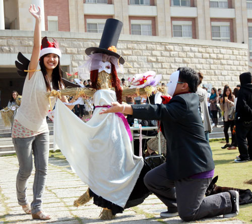 據(jù)報道,亞洲大學創(chuàng)意設(shè)計學院22日舉辦一場別開生面的稻草人選美走秀活動。院長賴淑玲表示,“稻草人也可以很酷,很漂亮”,學校附近很多稻田,秋收后,常見稻田中孤單稻草人,2010年特別在11月底發(fā)動學生撿拾稻草回來曬干,并制作稻草人,利用學生創(chuàng)意把稻草人變美了。