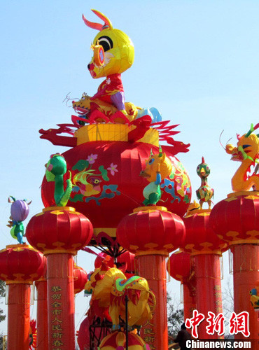圖為揚(yáng)州燈區(qū)設(shè)置的主燈,以玉兔送福、群獅賀歲為表現(xiàn)主題。中新社記者 崔佳明 攝