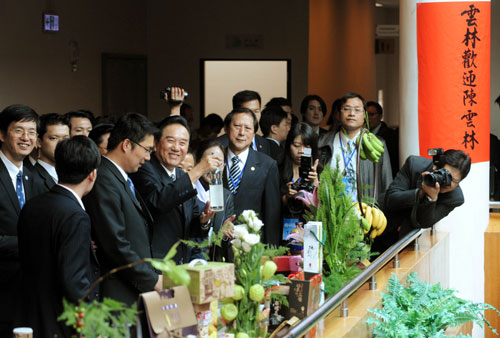 大陸海協(xié)會長陳云林(前左3)26日率團到云林科技大學,與當?shù)剞r、漁業(yè)代表舉行座談會。圖片來源:“中央社”