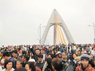 全臺第一座開啟式景觀橋“鵬灣跨海大橋”昨天通車,民眾涌上大橋拍照同樂。圖片來源:臺灣《聯(lián)合報》