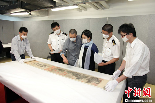5月18日,北京海關(guān)快速驗(yàn)放赴臺(tái)北故宮博物院《山水合璧—黃公望與富春山居圖特展》參展的12件珍貴文物。 中新社發(fā) 雷虹 攝