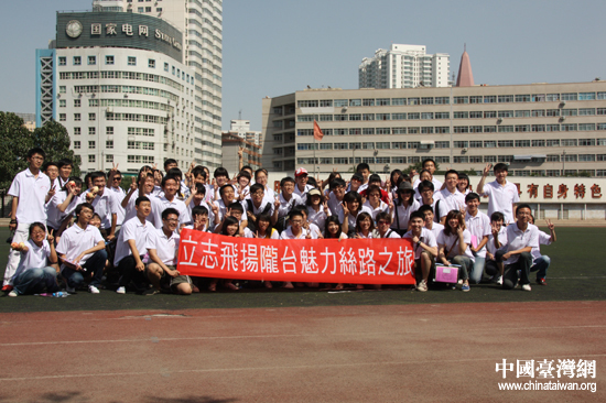 參加“隴臺(tái)百名中學(xué)生魅力絲路體驗(yàn)之旅”活動(dòng)的兩地中學(xué)生在蘭州一中體育場(chǎng)合影。(中國(guó)臺(tái)灣網(wǎng) 宿靜 攝)