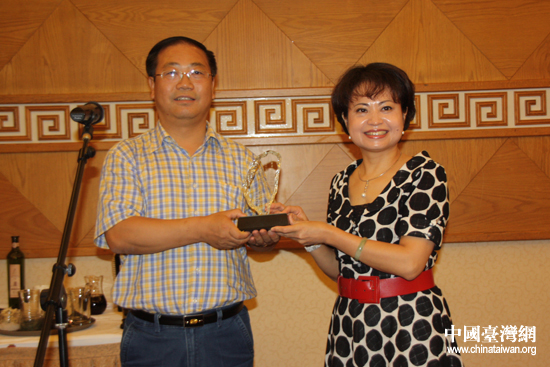 在7日晚間舉行的歡迎晚宴上甘肅省臺辦主任趙少智與臺灣知名人士王齡嬌交換禮物。(中國臺灣網(wǎng) 宿靜 攝)
