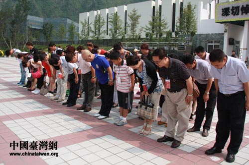 汶川地震遺址紀(jì)念廣場(chǎng)上,在臺(tái)四川新娘及家屬們向遇難的同胞三鞠躬。(中國臺(tái)灣網(wǎng) 楊永青 攝)