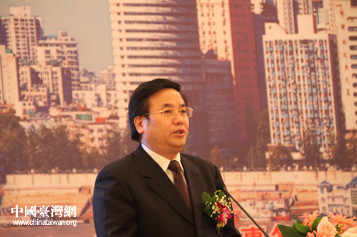 2011鄂臺產(chǎn)業(yè)合作與發(fā)展論壇7日上午在武昌洪山賓館舉行,武漢市長唐良智發(fā)表演講。(中國臺灣網(wǎng) 楊麗 攝)