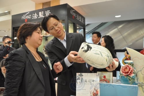 據(jù)介紹,臺(tái)灣法藍(lán)瓷與臺(tái)北故宮博物院合作,取得正式授權(quán),以館藏經(jīng)典畫作為藍(lán)本,法藍(lán)瓷華東區(qū)吳經(jīng)理也與現(xiàn)場(chǎng)來賓介紹清朝宮廷畫家郎世寧的“虞美人與蝴蝶花”、臺(tái)北故宮人氣典藏“翠玉白菜”、文人皇帝宋徽宗名作“蠟梅山禽圖”等。臺(tái)北故宮博物院以豐富典藏聞名全球,典藏總數(shù)超過65萬件,其中許多皆為皇家典藏藝品。