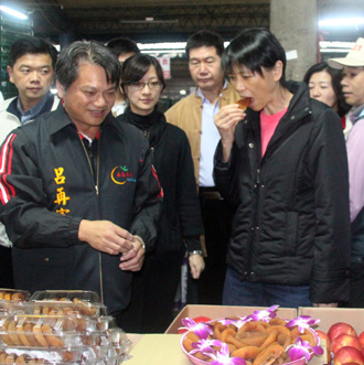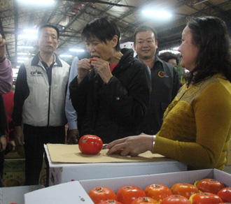周美青造訪嘉義市果菜市場(chǎng),大口吃甜柿,直說“好吃!”圖片來源:臺(tái)灣《聯(lián)合報(bào)》