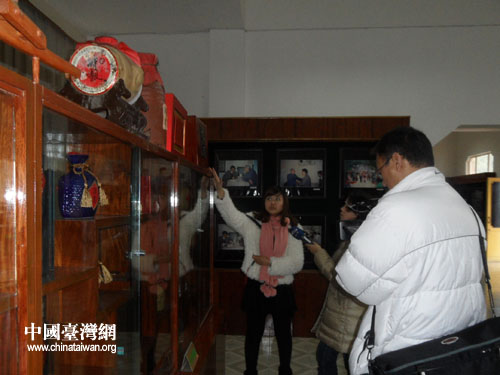 臺灣記者在“酒鬼酒”展示館采訪,工作人員講解“酒鬼酒”文化。(圖片來源:湘西自治州臺辦)