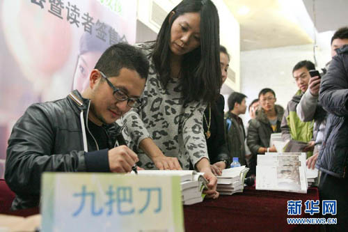 1月11日,臺灣知名網(wǎng)絡文學作家九把刀(藝名)在北京西單圖書大廈為讀者簽名。當日,《那些年,我們一起追的女孩》新書簽售活動在北京舉行。作者九把刀本名柯景騰,被譽為臺灣網(wǎng)絡文學的領軍人物。其自傳體小說《那些年,我們一起追的女孩》講述了作者九把刀的一段青春往事。根據(jù)小說改編、由九把刀親任導演的同名電影于1月6日登陸內地市場,受到觀眾熱捧。新華社記者 張帆 攝
