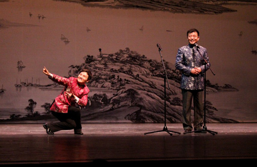 國(guó)家一級(jí)相聲演員李偉建、武賓表演的相聲《天天習(xí)舞》以說(shuō)唱結(jié)合的表演方式,形象生動(dòng)的肢體動(dòng)作,讓在場(chǎng)觀眾無(wú)不前仰后合,拍手叫好,兩度返場(chǎng)演出,讓本是同根同源的兩岸文化交流沒(méi)有任何距離。應(yīng)寧、王磊表演的對(duì)口相聲《講四書(shū)》以風(fēng)趣幽默的表演方式,融入當(dāng)?shù)卣Z(yǔ)言元素,充分展現(xiàn)了中華民族的文化魅力。劉穎、浩楠表演的相聲《減肥》以反諷的方式結(jié)合熱點(diǎn)話題,用詼諧幽默的語(yǔ)言,既愉悅了觀眾又展示了中華民族的語(yǔ)言魅力。這些精彩的語(yǔ)言藝術(shù)表演,讓當(dāng)?shù)孛癖姼苯恿私庵腥A民族傳統(tǒng)文化,感知兩岸親情,認(rèn)同同根同源。北京雜技團(tuán)的《女子雙人柔術(shù)》運(yùn)用各種“頂”的技巧和“連續(xù)軟翻”、“雙人造型”等優(yōu)美動(dòng)作征服了在場(chǎng)的每位觀眾。年輕魔術(shù)演員王璐的魔術(shù)《伊人花影》,如夢(mèng)如幻,也為臺(tái)灣觀眾留下了深刻的印象。臺(tái)北曲藝團(tuán)的快板演員林文斌也同臺(tái)獻(xiàn)藝,表演了快板《武松打店》。