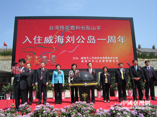 4月16日上午,臺灣梅花鹿和長鬃山羊入住一周年紀念活動現場。(圖片來源:威海市臺辦)