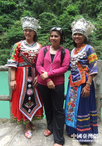領隊呂素貞與兩“苗族少女”合影留念。(黔南州臺辦 張榮周 攝)
