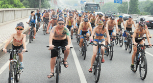 昨日,株洲60多位自行車愛好者,赤膊上身涂著彩繪騎行全城,倡導(dǎo)“低碳、環(huán)!钡慕】瞪罾砟,為奧運助威。他們中的17位還將前赴寶島臺灣進(jìn)行為期十三天的環(huán)臺灣騎行!拔覀兿胗眠@種行為藝術(shù)來宣傳低碳與環(huán)保,倡導(dǎo)綠色的出行方式!标爢T們表示。譚平華 張平 攝影報道