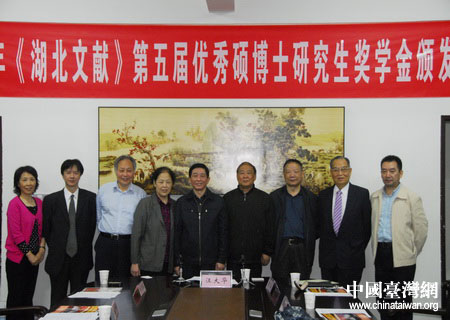 中國(guó)臺(tái)灣網(wǎng)10月19日武漢消息 臺(tái)灣《湖北文獻(xiàn)》第5屆優(yōu)秀碩博士研究生獎(jiǎng)學(xué)金頒獎(jiǎng)儀式日前湖北大學(xué)舉行。來(lái)自臺(tái)灣的《湖北文獻(xiàn)》雜志社代表向武漢大學(xué)、華中師范大學(xué)、中國(guó)人民大學(xué)、湖北大學(xué)等高校的13名獲獎(jiǎng)學(xué)生頒發(fā)了獎(jiǎng)狀和獎(jiǎng)金。