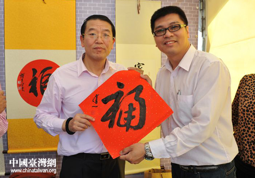 中國書法家協(xié)會會員、北京書法家協(xié)會理事、北京市宣武區(qū)文聯(lián)副主席程茂全送“福”給臺灣市民。(北京通訊員 馬宇衡 攝)