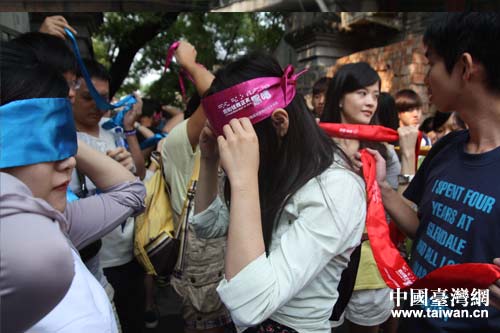 臺灣青年學(xué)生蒙眼準(zhǔn)備進(jìn)入活動中心。(中國臺灣網(wǎng) 雍紫薇 攝)