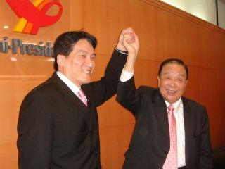 統(tǒng)一企業(yè)董事長高清愿(右)12日請辭董事長職務(wù),改由總經(jīng)理羅智先(左)接任。來源:臺灣“中央社”