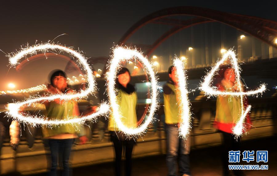 2013年12月30日晚,在四川省南充市順慶區(qū)濱江大道,南充市順慶志愿者用煙花棒在空中寫出數(shù)字“2014”字樣,迎接新年的到來。新華社發(fā)(李向雨 攝)