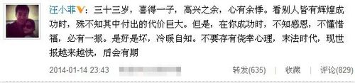 1月14日晚,汪小菲似有感而發(fā)在微博寫下文字:“三十三歲,喜得一子,高興之余,心有余悸?磩e人皆有輝煌成功時,殊不知其中付出的代價巨大。但是,在你成功時,不知感恩,不懂惜福,必有一報。是好是壞,冷暖自知。不要存有僥幸心理,末法時代,現(xiàn)世報越來越快,后會有期!本W(wǎng)友在猜測其微博深意時,也發(fā)現(xiàn)他最開始的兩句話“三十三歲,喜得一子”疑泄露了大S所懷為男孩。