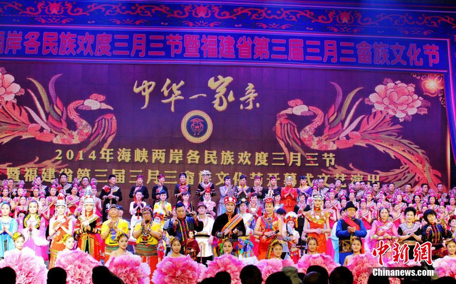 4月2日是中國農歷三月初三,2014海峽兩岸各民族歡度“三月三”節(jié)暨福建省第三屆“三月三”畬族文化節(jié)在福建福鼎市開幕,兩岸少數民族音樂舞蹈相繼展示上演,近千名少數民族同胞共聚于此,歡慶“三月三”。此次文化節(jié)由中華民族團結進步協(xié)會、福建省海外聯誼會、福建省少數民族發(fā)展基金會、福建省閩臺交流協(xié)會、寧德市中華畬族宮協(xié)會、中華畬族文化與慈善基金會共同主辦。圖為開幕現場。(中新社發(fā) 呂巧琴 攝)
