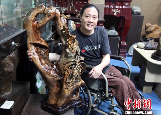 臺(tái)灣輪椅上的雕刻家林正發(fā)和他的馬年新作“春意嫣然”。