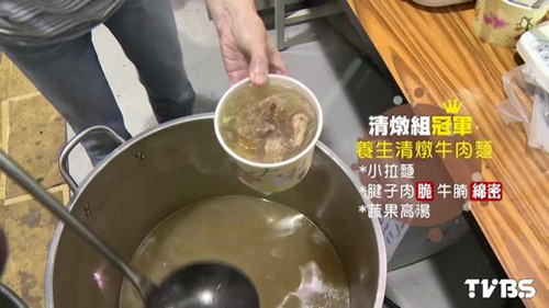 小拉面,過水汆燙20秒馬上撈起,再放進,帶筋脆彈腱子肉,和口感綿密的牛腩,最后琳上蘋果、西芹、白蘿卜、洋蔥,熬煮的蔬果高湯清燉組第一名,主打清爽口感。臺北牛肉面節(jié)清燉組冠軍業(yè)者高呼:“冠軍牛肉面在這!
