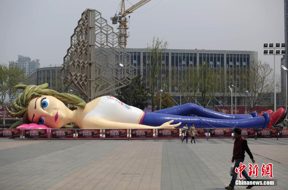 4月9日,一座高大二十多米的充氣人偶現(xiàn)身南京街頭,雖然是臥倒在地,卻很是搶眼。中新社發(fā) 泱波 攝