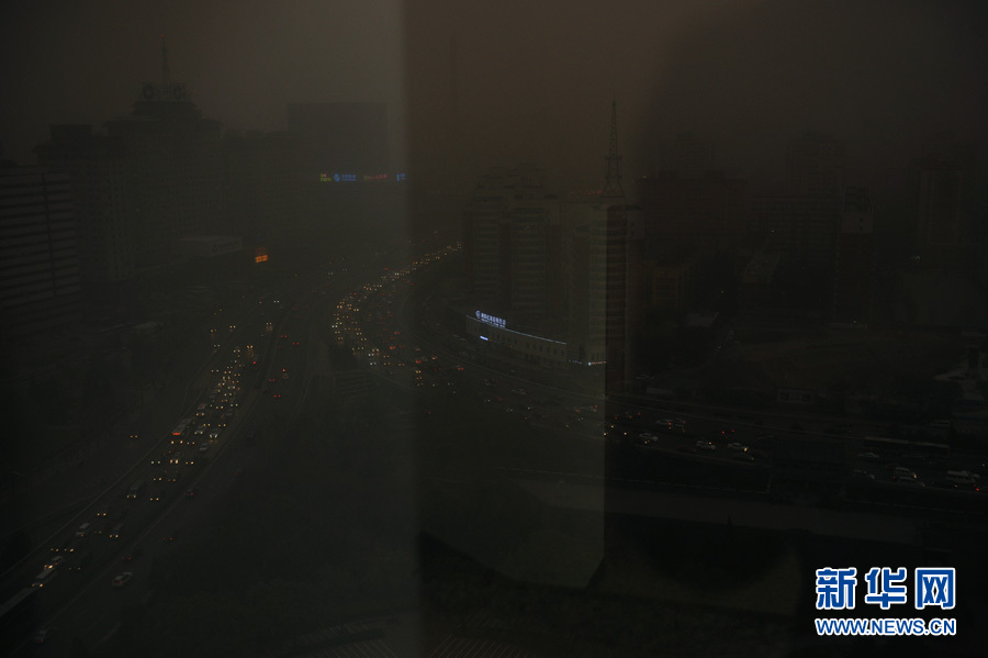 2015年4月15日17時許,北京遭遇沙塵暴襲擊,城區(qū)能見度降低。圖為北京西便門橋附近場景。新華網(wǎng) 李清攝